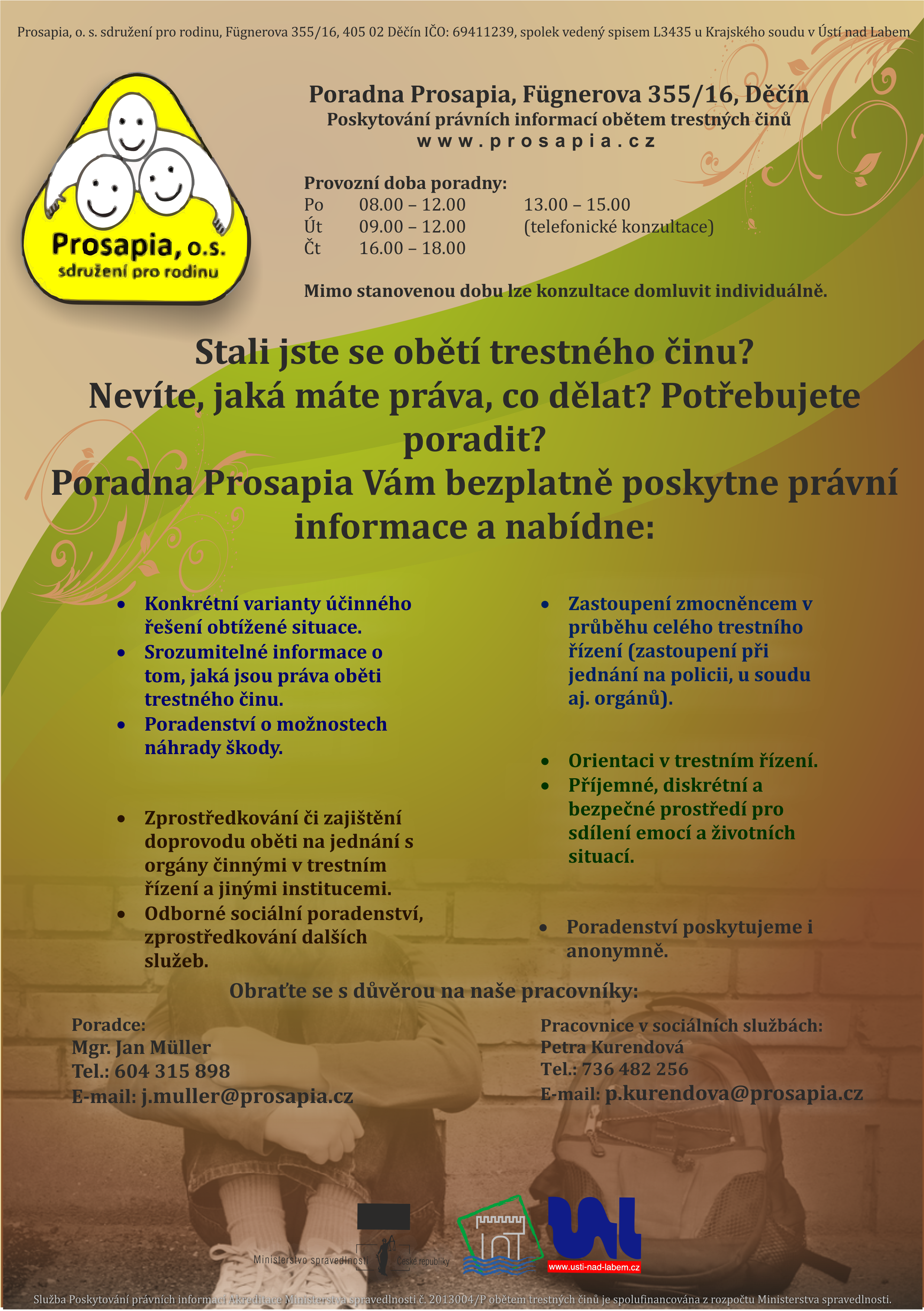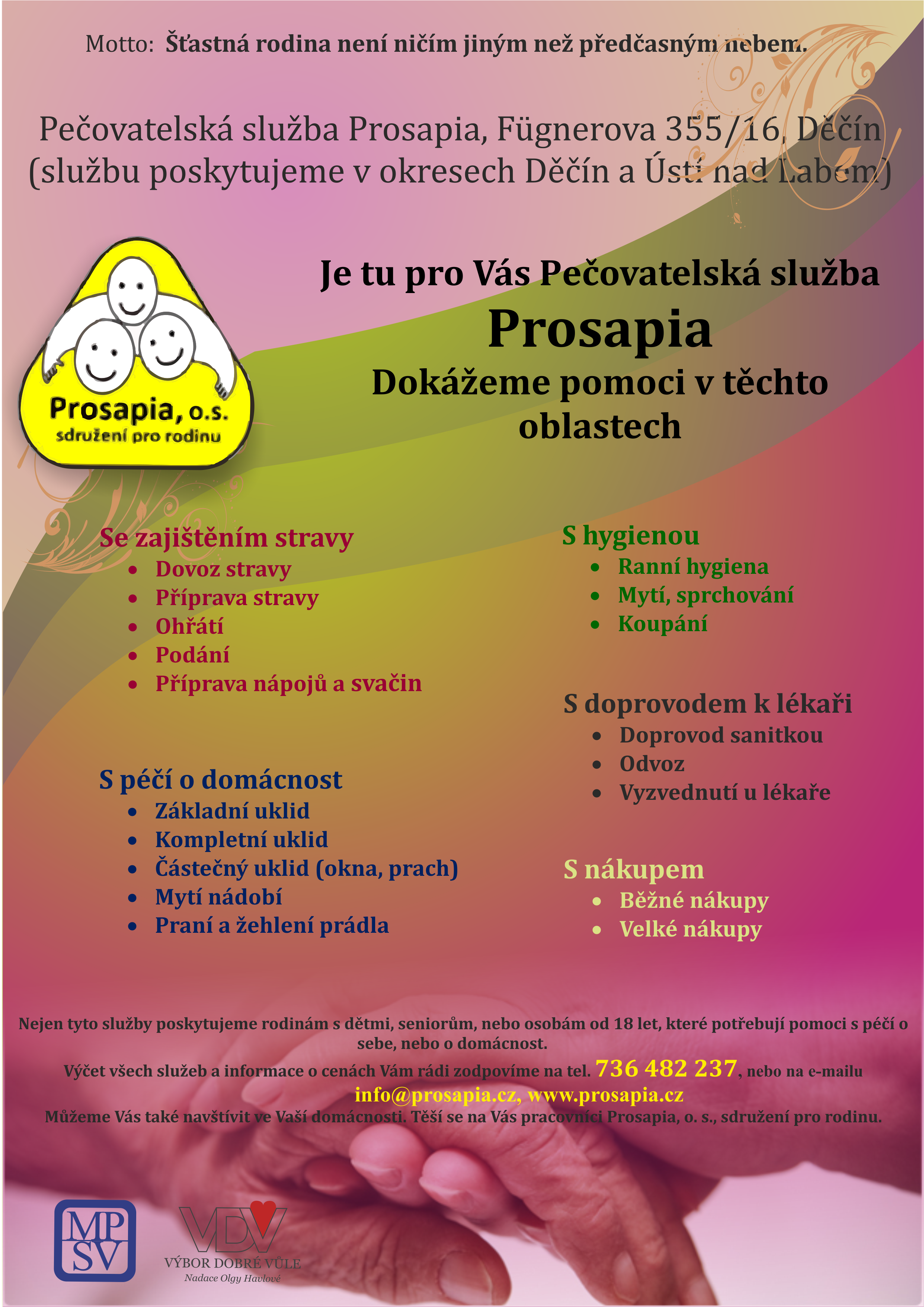 V jednotlivých letáčcích v příloze se dozvíte více o službách, které poskytuje PROSAPIA o.s., sdružení pro rodinu. Jde především o pečovatelskou službu, denní centrum pro seniory, Poradnu Prosapia a poradnu pro oběti trestných činů.