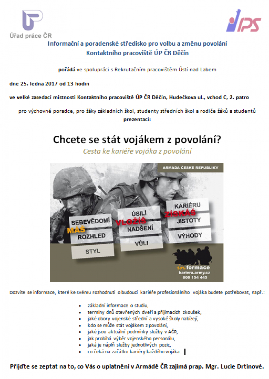 Kontaktní pracoviště ÚP ČR Děčín, Informační a poradenské středisko pro volbu povolání pořádá ve spolupráci s Rekrutačním pracovištěm Ústí nad Labem dne 25. ledna 2017 od 13 hodin ve velké zasedací místnosti Kontaktního pracoviště ÚP ČR Děčín, Hudečkova ul., vchod C, 2. patro pro výchovné poradce, pro žáky základních škol, studenty středních škol a rodiče žáků a studentů prezentaci CHCETE SE STÁT VOJÁKEM Z POVOLÁNÍ? Cesta ke kariéře vojáka z povolání.