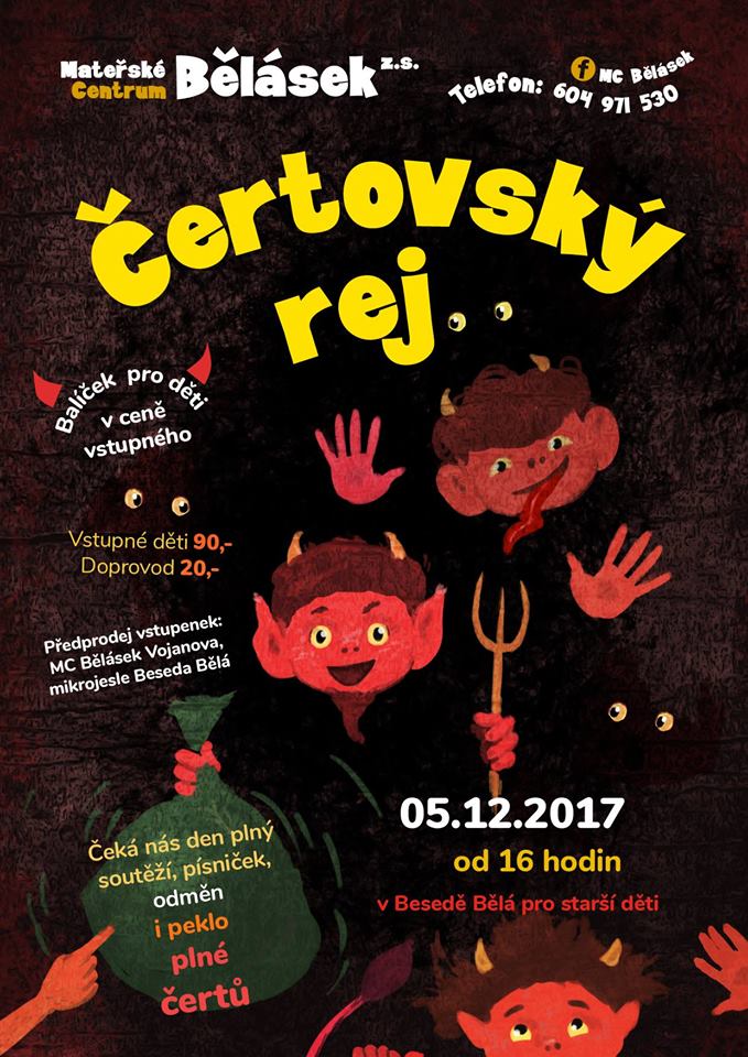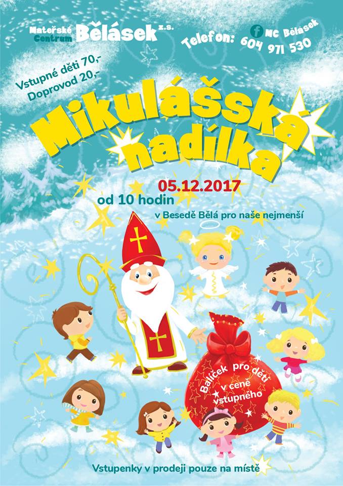 5. prosince si Mateřské centrum Bělásek připravilo pro děti a rodiče Mikulášskou nadílku pro nejmenší děti od 10hodin a Čertovský rej v Besedě Bělá od 16 hodin pro starší děti. Více informací v přílohách.