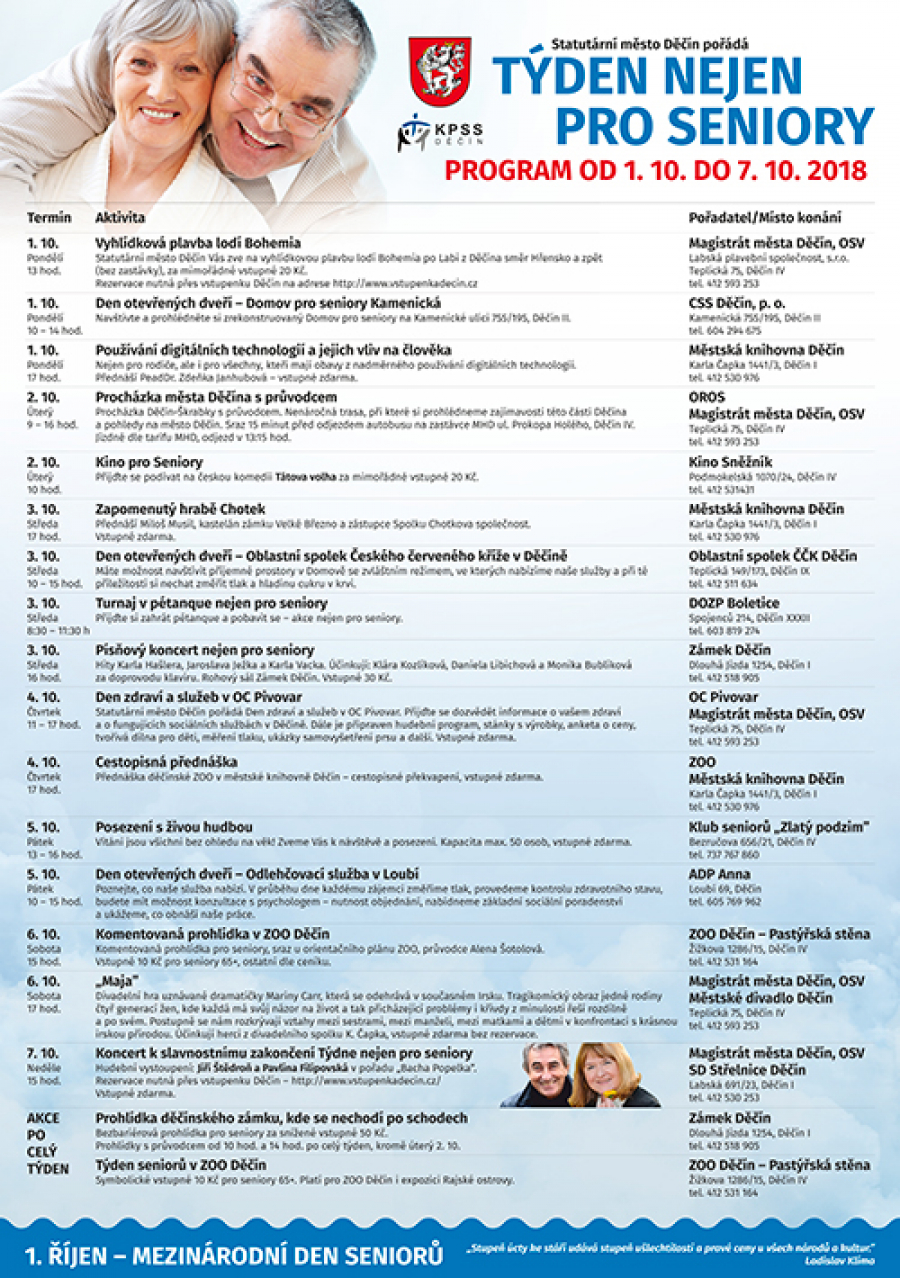 Statutární město Děčín si spolu s partnerskými organizacemi u příležitosti Mezinárodního dne seniorů připravilo v týdnu od 1. do 7. října bohatý program pro seniory a jejich blízké. Bude možné prohlédnout si například některé sociální služby ve městě, připraveny jsou také kulturní a sportovní aktivity, vše buď zdarma nebo za zvýhodněnou cenu.