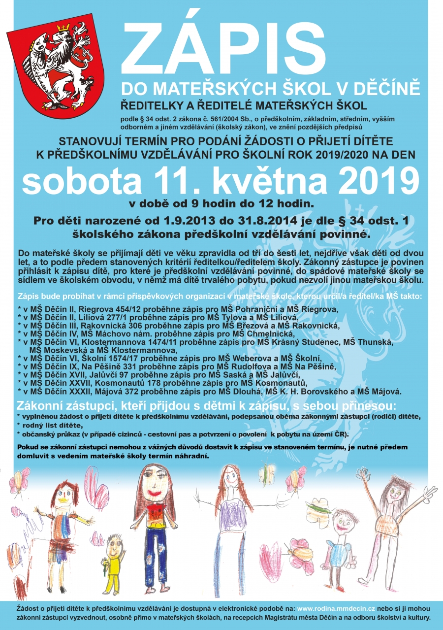 Ředitelky a ředitelé základních škol podle § 34 odst. 2 zákona č. 561/2004 Sb., o předškolním, základním, středním, vyšším odborném a jiném vzdělávání (školský zákon), ve znění pozdějších předpisů, stanovují termín pro podání žádosti o přijetí dítěte k předškolnímu vzdělávání pro školní rok 2019/2020 na sobotu 11. května 2019 v době od 9 do 12 hodin.