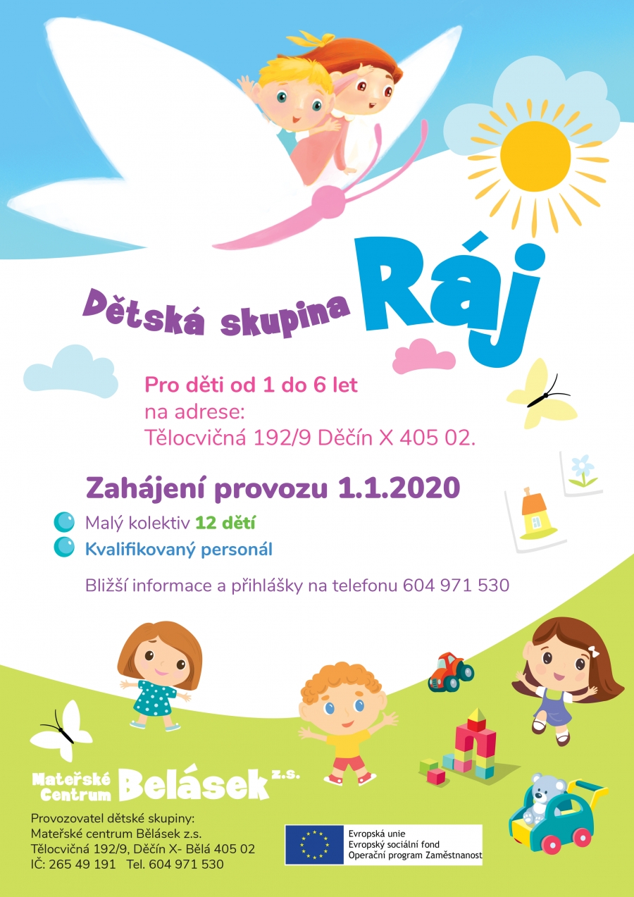Dětská skupina Ráj je otevřena od 1. ledna 2020 a je určena pro děti od 1 roku do 6 let. Stále do menšího kolektivu 12 dětí přijímá nové členy, více informací v letáčku.