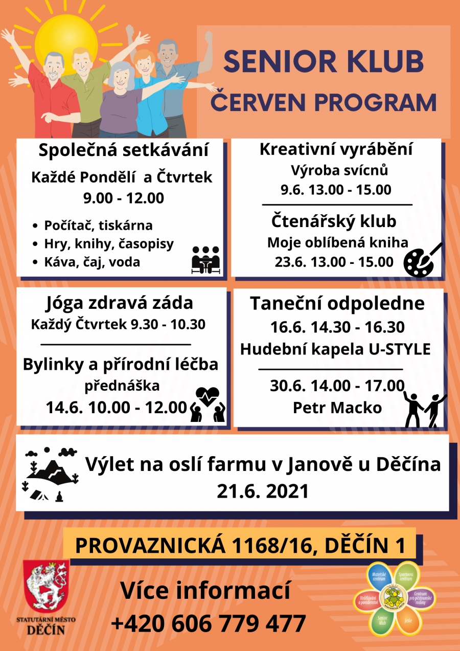Od června bude nově Senior klub fungovat v prostorách organizace Rákosníček Děčín, v Provaznické ul. 16, Děčíně 1. ( Slepá ulice, podél náhonu, vedle autosalonu Horejsek).