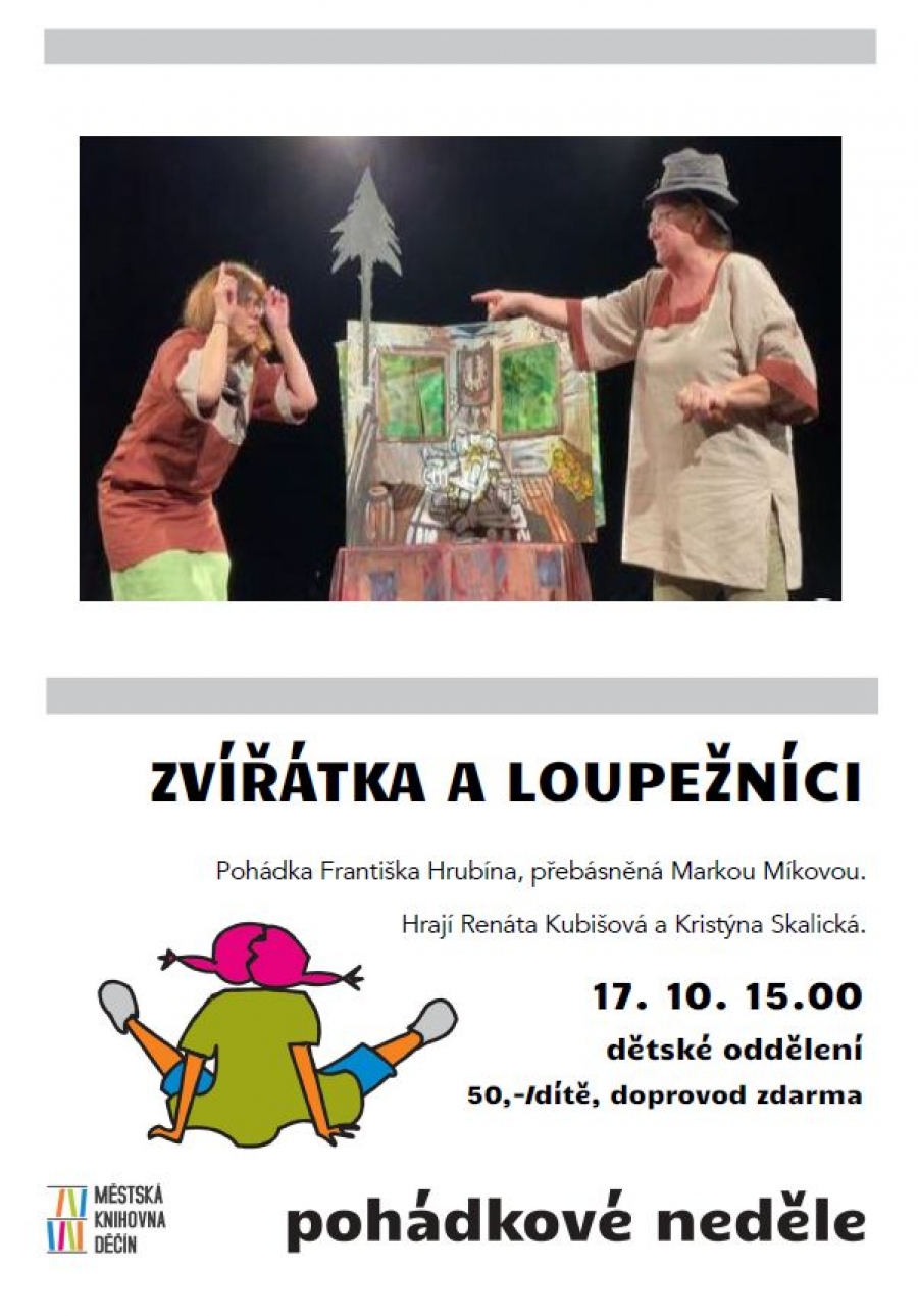 V neděli 17.října bude v knihovně od 15 hodin probíhat představení pro děti s názvem Zvířátka a loupežníci. Pohádku Františka Hrubína přebásnila Marka Míková. Hrají Renáta Kubišová a Kristýna Skalická. Cena 50.-/dítě, doprovod zdarma.