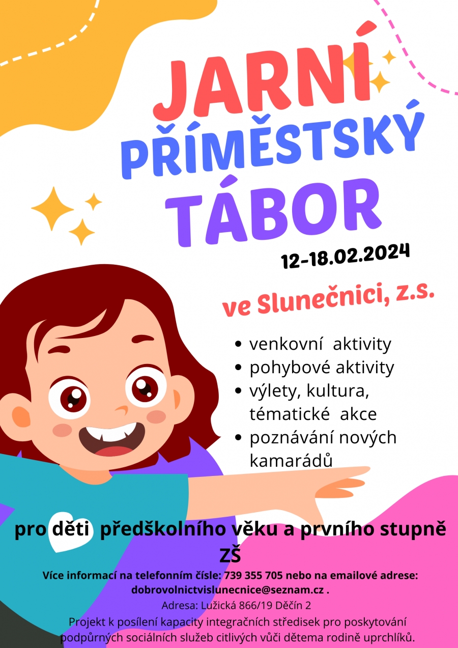 Jarní příměstský tábor je pro žáky prvního stupně a díky projektu, který se zaměřuje na integraci uprchlíku v České republice je pro děti zcela zdarma a jsou vítáni i české děti. Lektorkami jsou ženy z Ukrajiny, které se zapojují do našich aktivit s dětmi už od počátku války na Ukrajině a dříve na Ukrajině s dětmi pracovaly. Informace o příměstském táboře naleznete v příloze na letáčku a dále i na našem telefonním čísle. Petra Baborová, Vedoucí dobrovolnického centra Slunečnice, z. s.