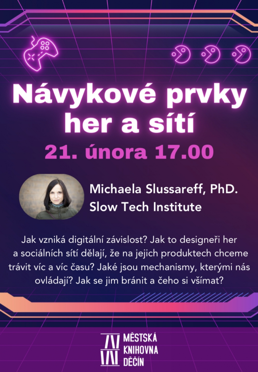 Návykové prvky her a sítí a jejich dopady na naše zdraví. Bližší informace zde: Městská knihovna Děčín