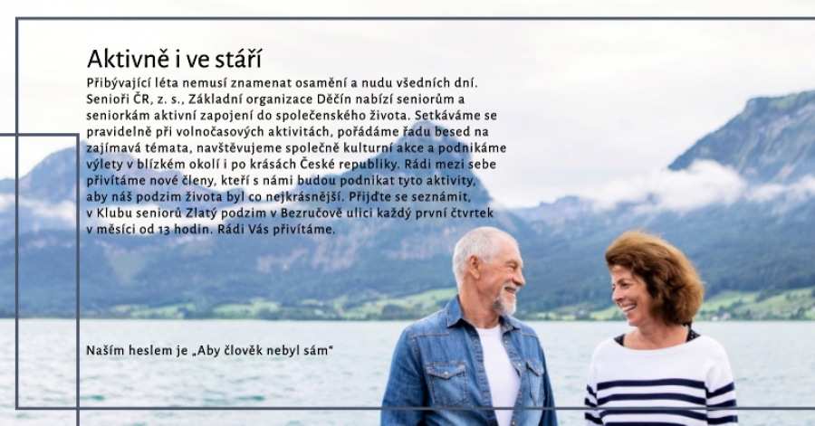 Přibývající léta nemusí znamenat osamění a nudu všedních dní. Senioři ČR, z.s., Základní organizace Děčín nabízí seniorům i seniorkám aktivní zapojení do společenského života. Setkáváme se pravidelně při volnočasových aktivitách, pořádáme řadu besed na zajímavá témata, navštěvujeme společně kulturní akce a podnikáme výlety v blízkém okolí i po krásách České republiky. Naším heslem je „Aby člověk nebyl sám“. Rádi mezi sebe přivítáme nové členy, kteří s námi budou podnikat tyto aktivity, aby náš podzim života byl co nejkrásnější. Přijďte se seznámit, v Klubu seniorů Zlatý podzim v Bezručově ulici každý první čtvrtek v měsíci od 13 hodin. Rádi vás přivítáme.