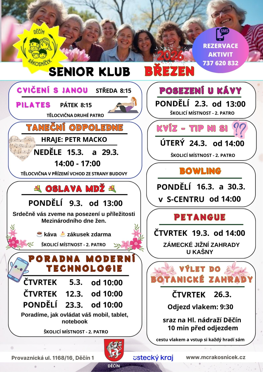 Tak jako každý měsíc, ani v březnu nezapomínáme s programem na naše milé seniory. Čekají nás tradiční setkání poradny moderních technologií, hry, posezení u kávy a hudební odpoledne, ale slavit budeme také březnový svátek žen, které mají u nás ten den kávičku a zákusek zdarma. Pokud nám bude přát počasí, zahrajeme si petangue v Jižních zámeckých zahradách. A vypravíme se na výlet do botanické zahrady. Tak vyrazte s námi!