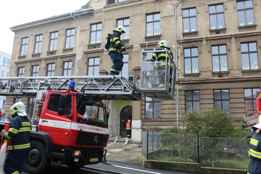 Figuranti – žáci 9. ročníku byli evakuováni výsuvným žebříkem nebo po schodišti za použití kyslíkových masek. Vše bylo velmi akční a kolemjdoucí se zastavovali s tím, zda jde opravdu jen o cvičení. Poděkování patří mjr. Ing. Jiřímu Hyklovi za vstřícnost a ochotu, s jakou zásah zařídil.