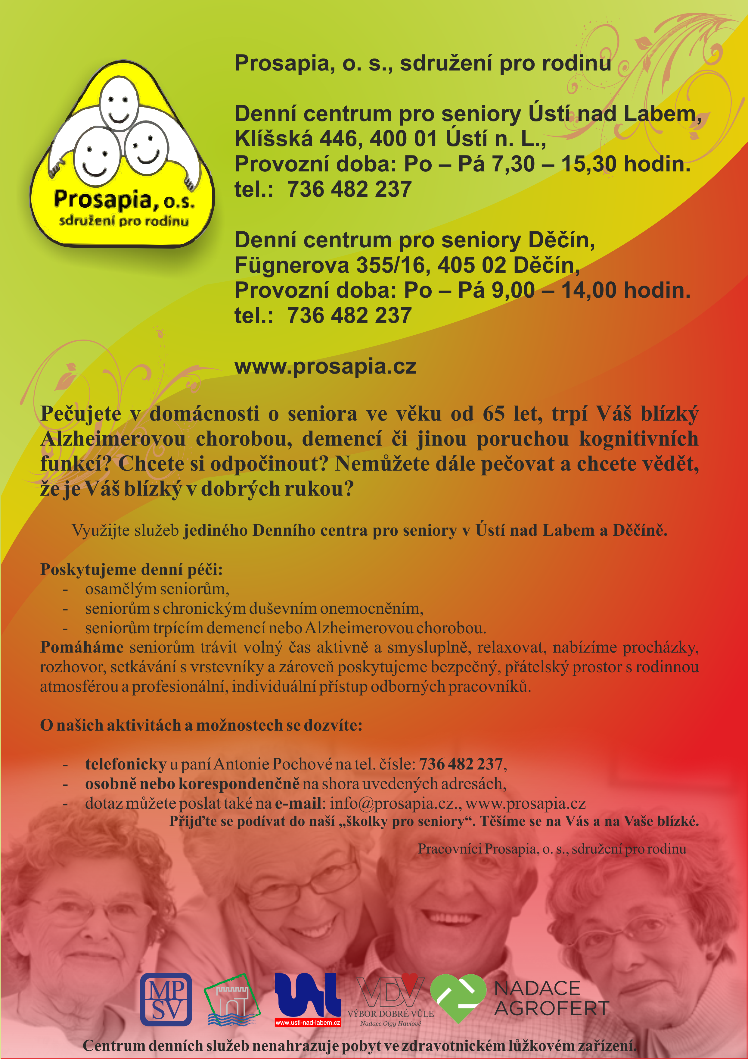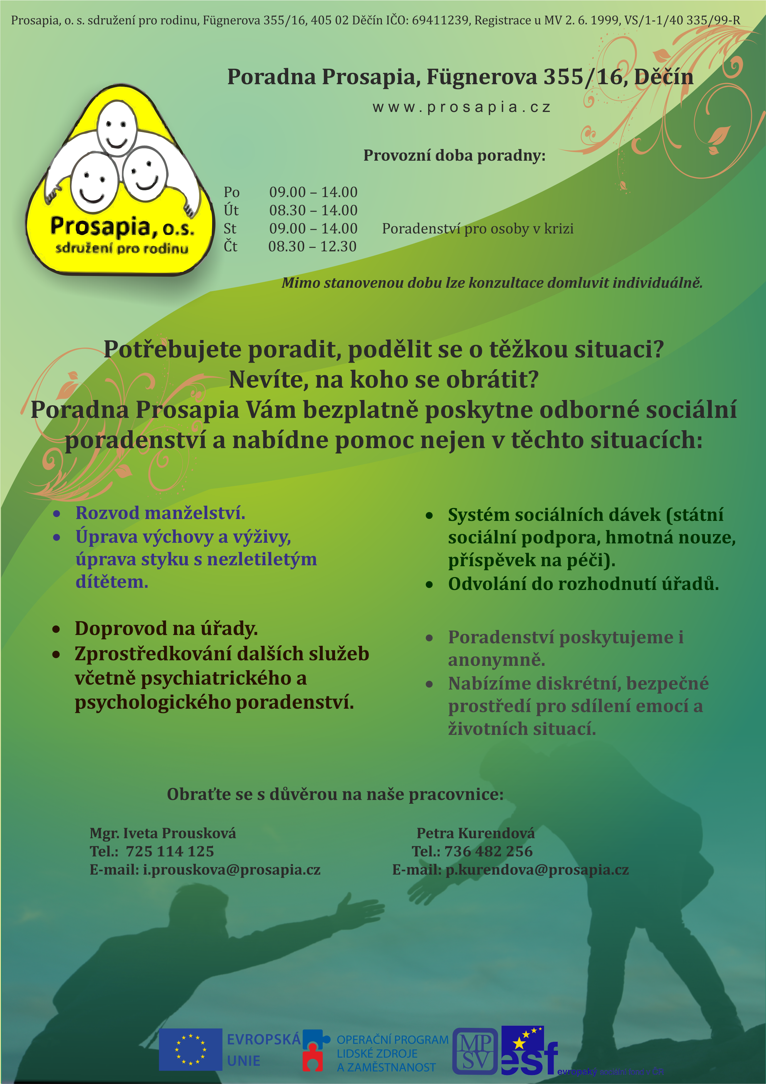 V jednotlivých letáčcích v příloze se dozvíte více o službách, které poskytuje PROSAPIA o.s., sdružení pro rodinu. Jde především o pečovatelskou službu, denní centrum pro seniory, Poradnu Prosapia a poradnu pro oběti trestných činů.