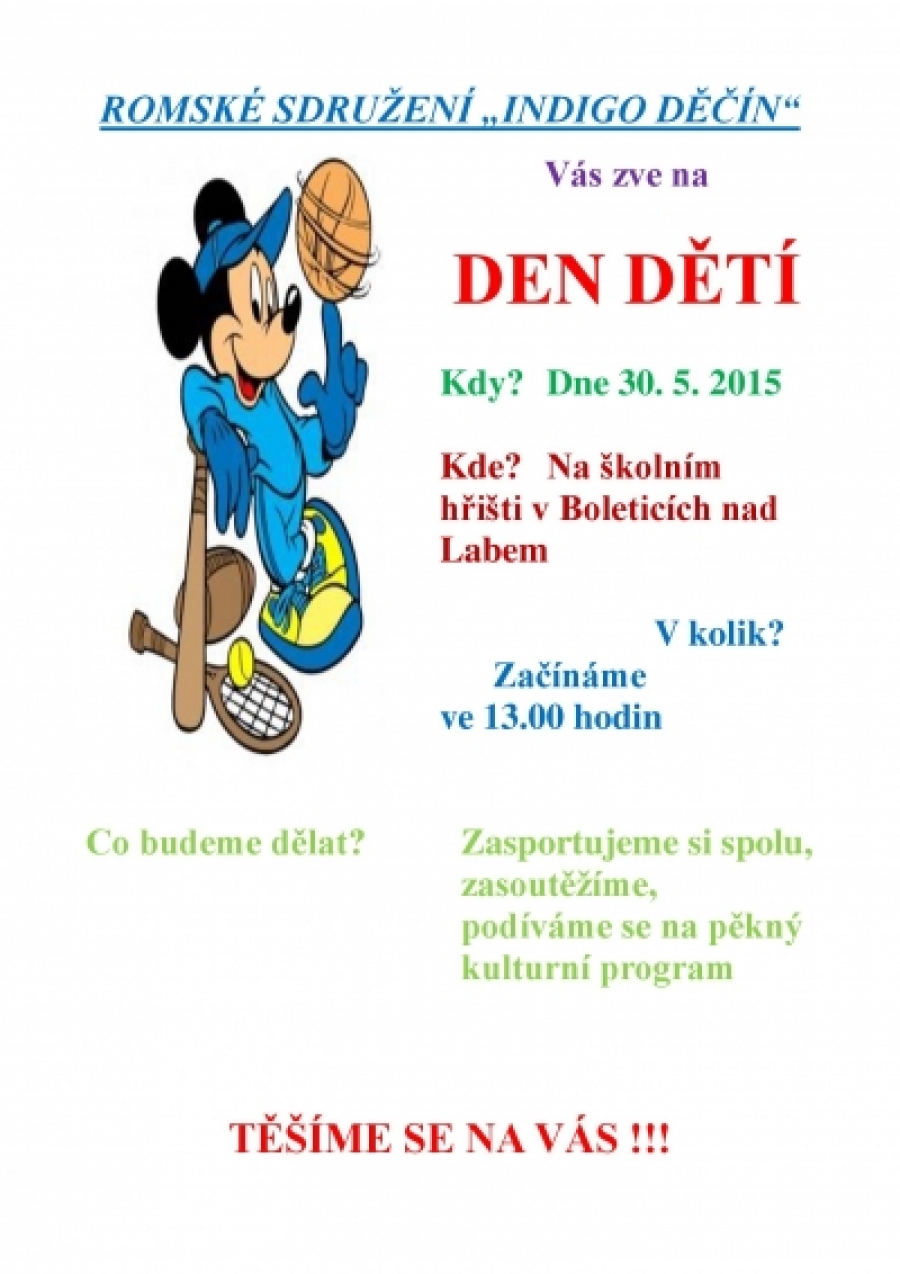 Romské sdružení "INDIGO Děčín" Vás zve v sobotu 30. 5. 2015 na Dětský den. Akce se koná na sportovním hřišti ZŠ Boletice. Program začíná ve 13:00 hodin zábavnými soutěžemi, sportovními aktivitami pro děti.