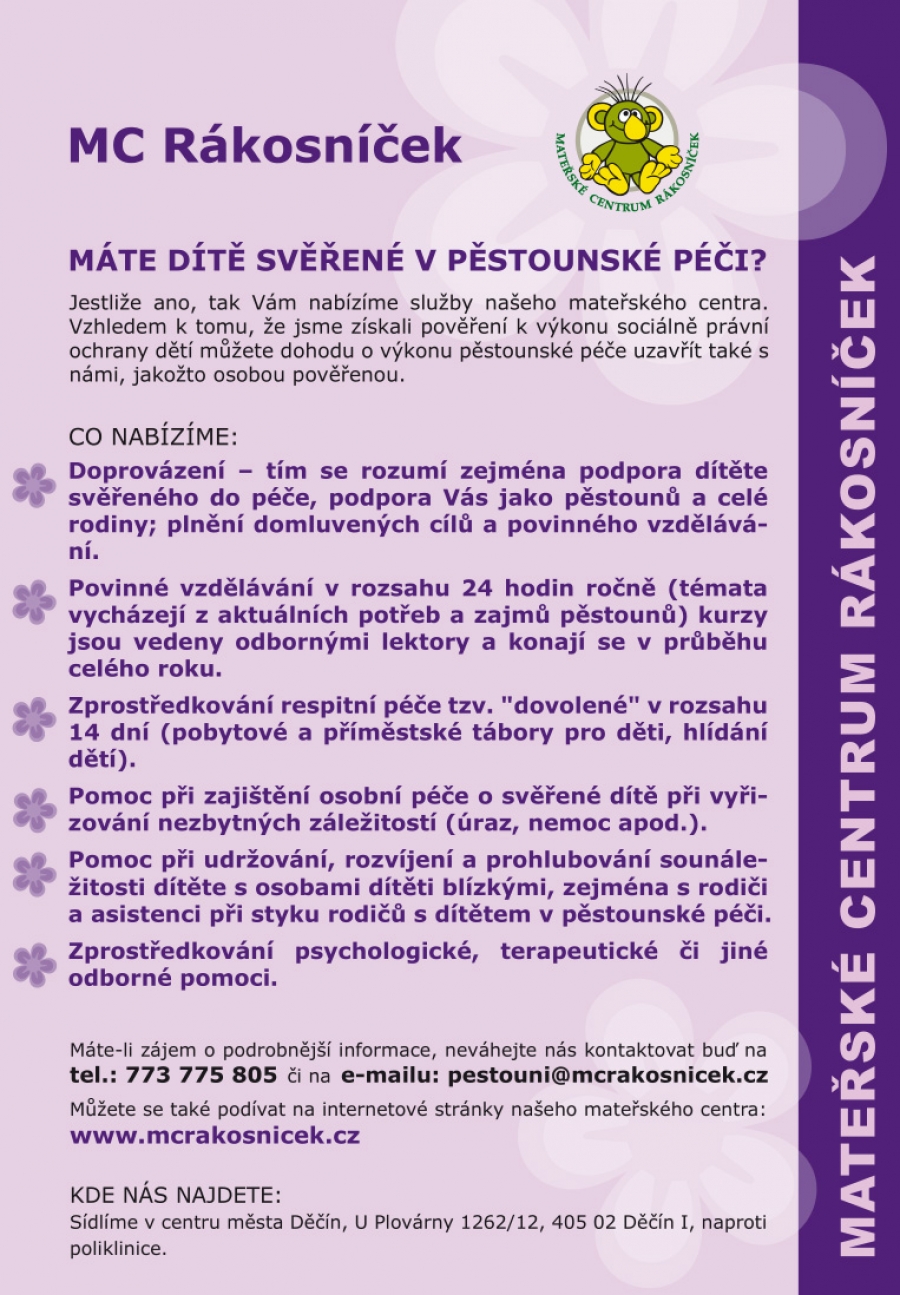 Máte dítě svěřené v pěstounské péči? Jestliže ano, MC Rákosníček vám nabízí své služby. Více informací v letáčku.